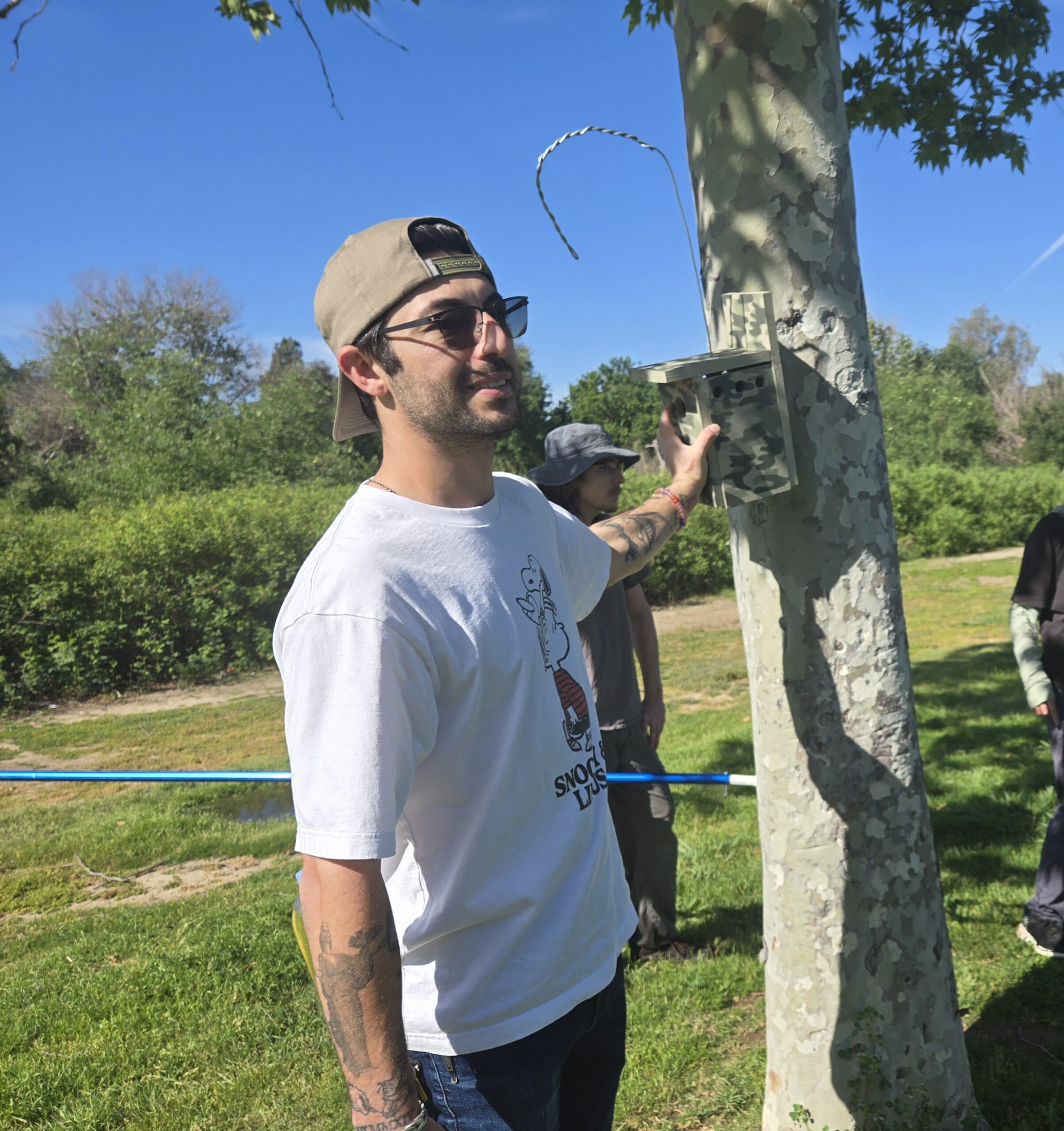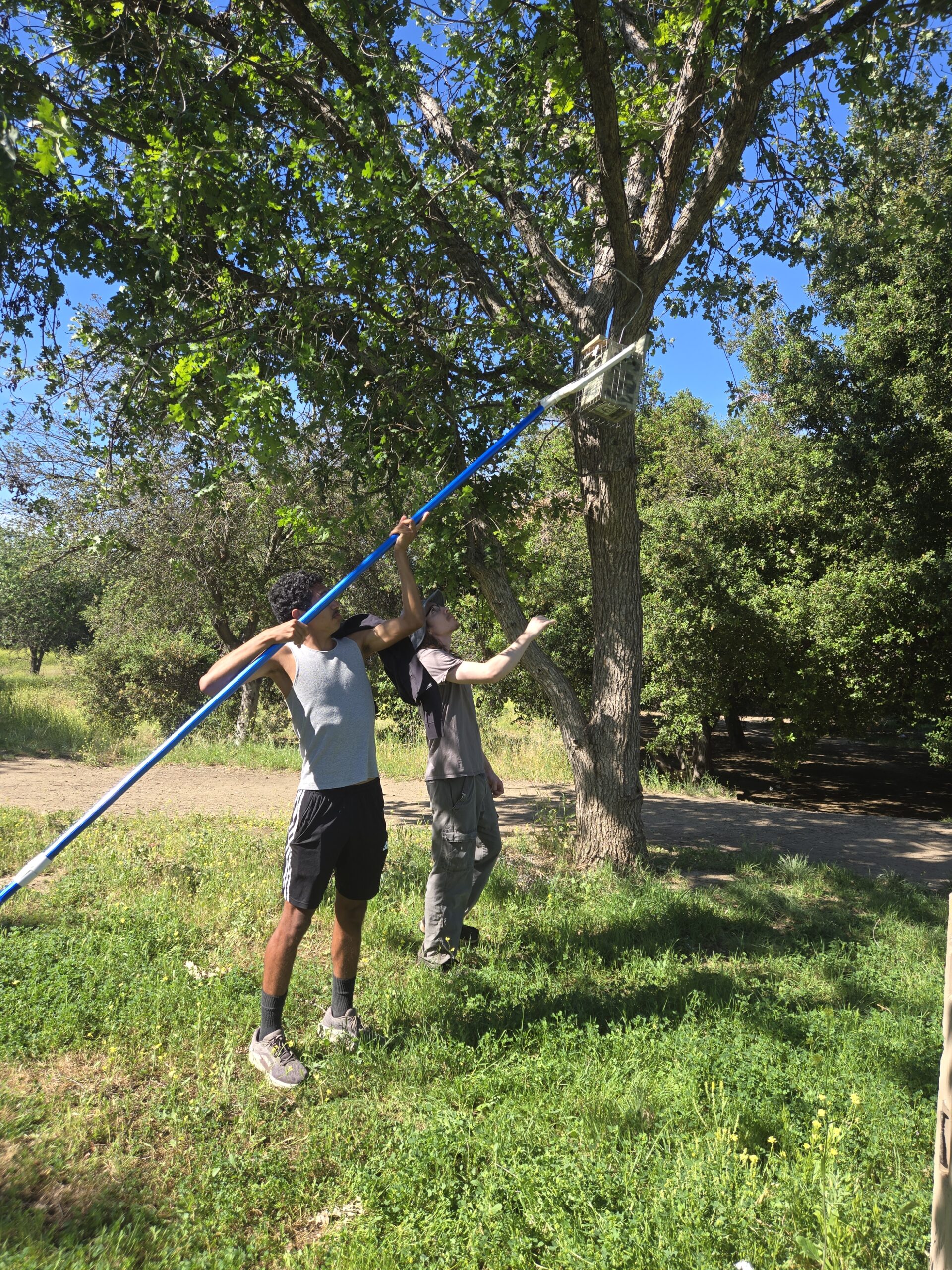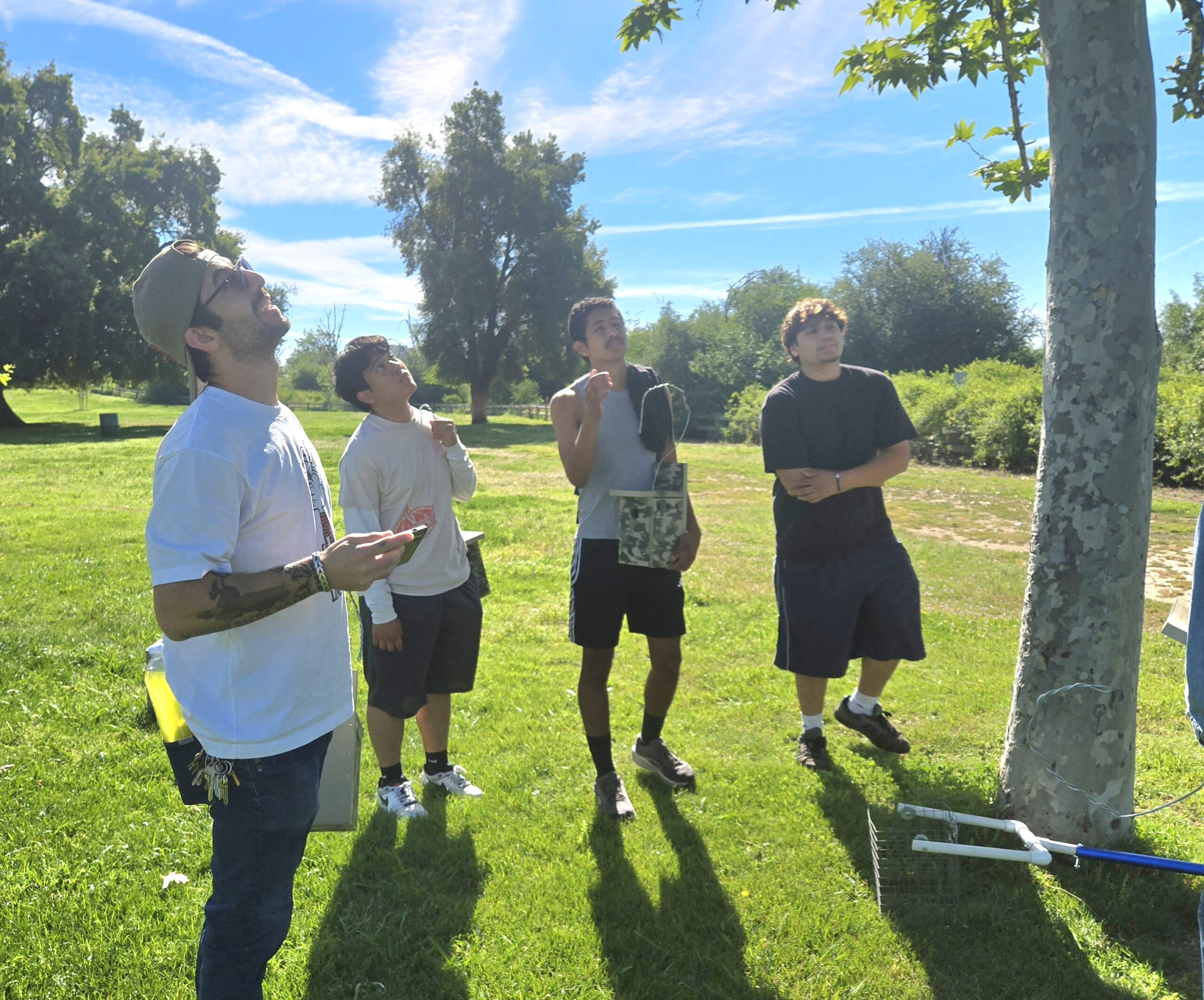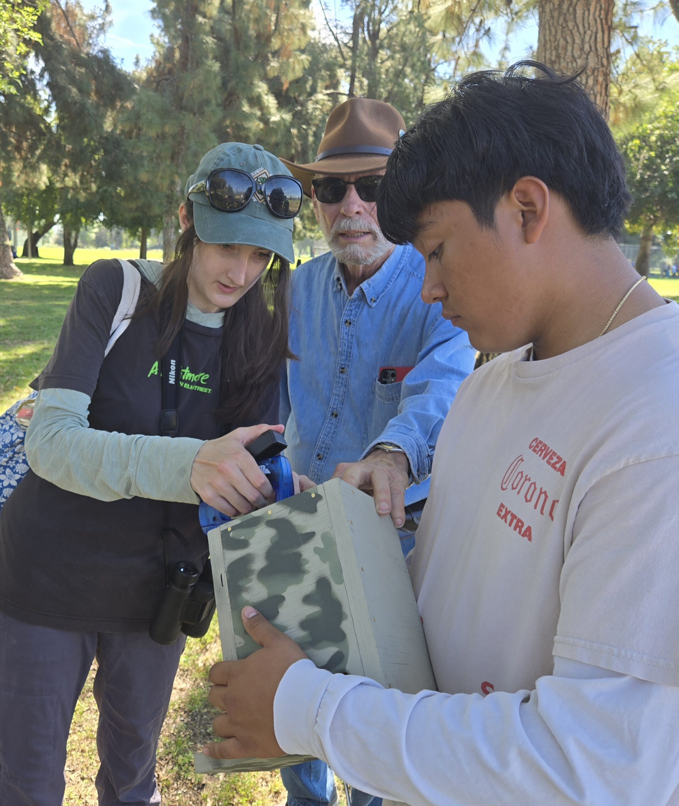 Students Art, David, Andres, and Gabriel joined Natalie Beckman-Smith and her brother Jack to install the boxes and were rewarded with the discovery of an active nest already containing eggs.