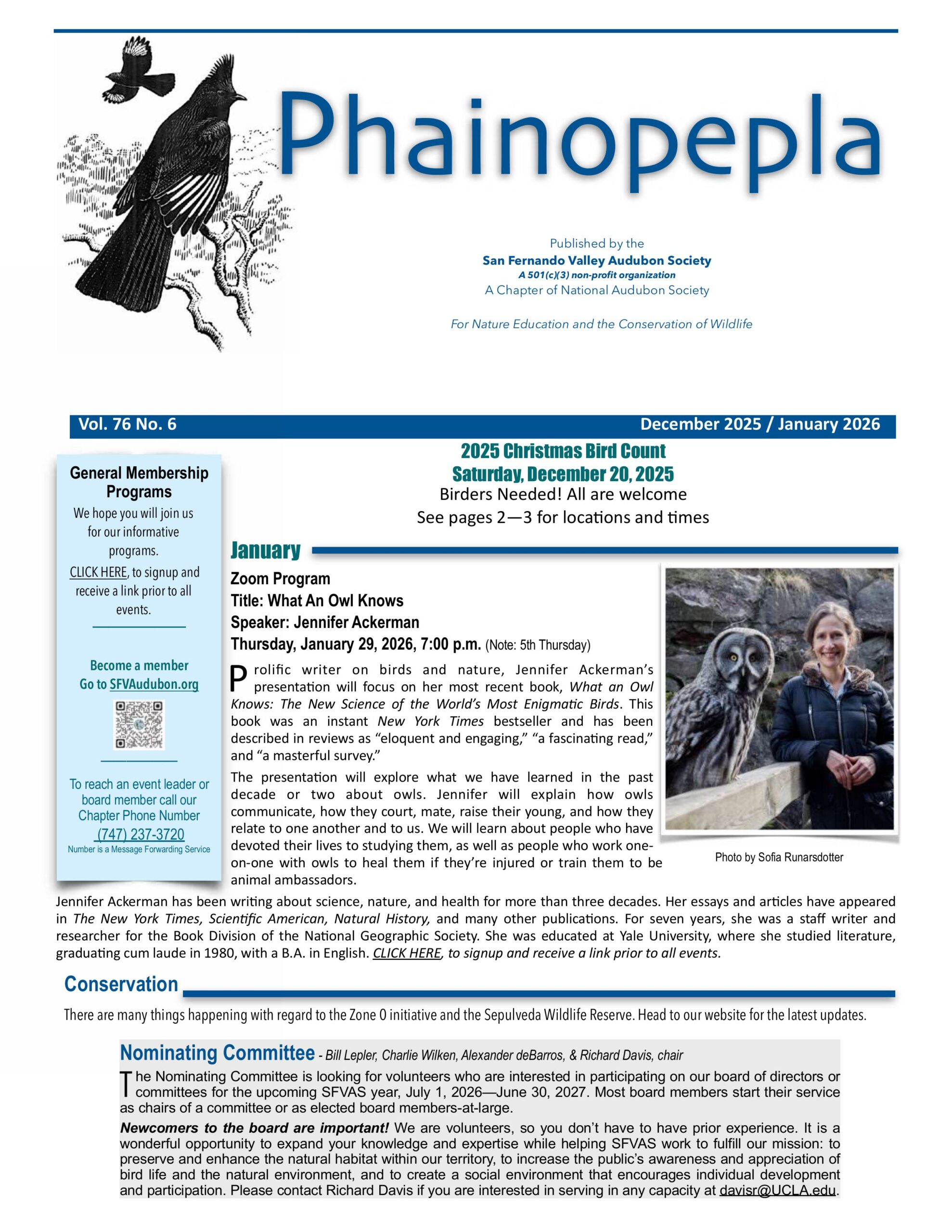 The PHAINOPEPLA is the newsletter of the San Fernando Valley Audubon Society, published six times a year. You can reach us at P.O. Box 7769, Van Nuys, CA 91404, or by phone at 818-347-3205.